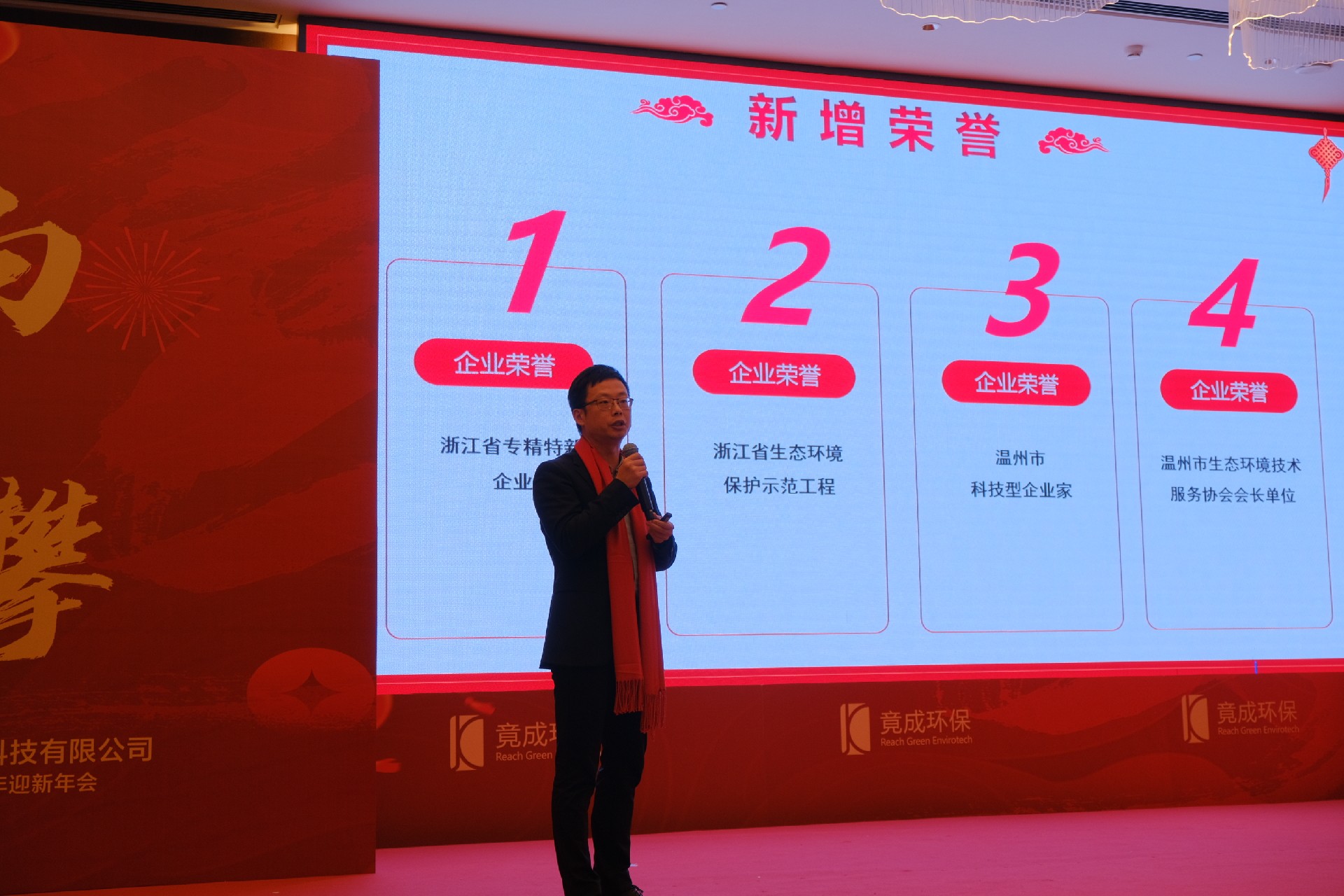 晚會開始,竟成環保董事長胡如意先生做2024年工作總結和新年展望,胡董的肯定和鼓勵、期望和鞭策,讓每一位員工對新的一年干勁十足、充滿信心。
