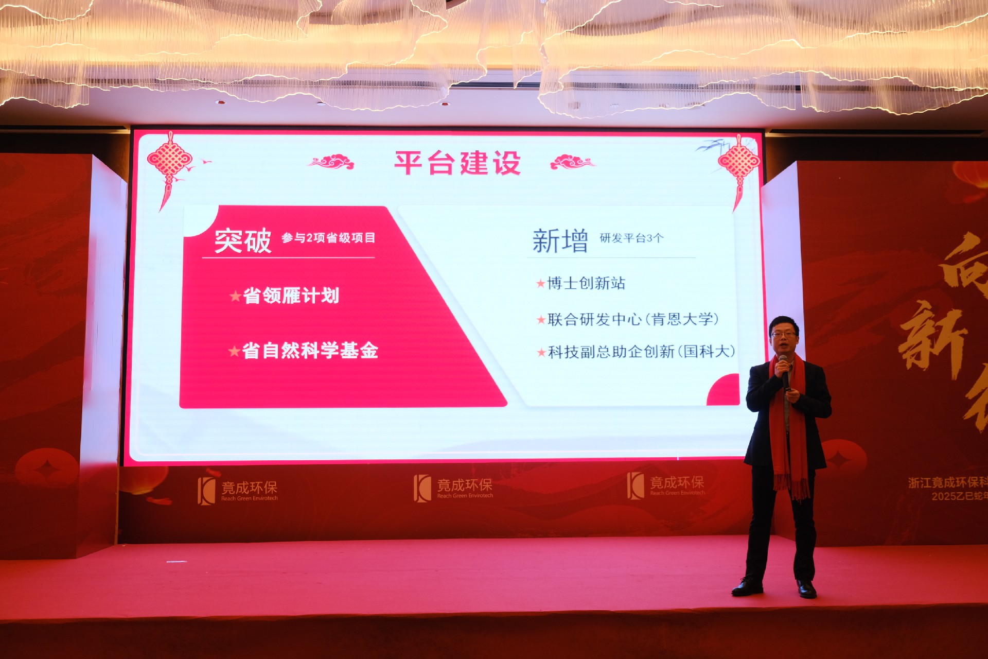 2025年1月22日,浙江竟成環保科技有限公司舉辦了2024年度總結表彰大會暨2025年度迎新年會,以此來答謝各位員工一年來的辛勤工作與默默付出。公司董事長胡如意、總經理陳永存、副總經理潘為剛、副總經理施家祺、副總經理李寶強以及子公司中譜檢測總經理沈強、副總經理張潔惠等領導、受邀嘉賓及公司全體員工齊聚一堂,共享盛事。